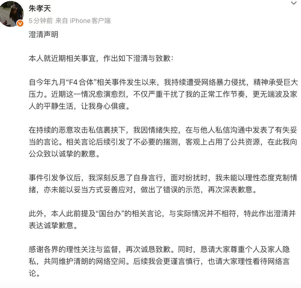 本人就近期相关事宜,作出如下澄清与致歉:自今年九月“F4合体”相关事件发生以来,我持续遭受网络暴力侵扰,精神承受巨大压力。近期这一情况愈演愈烈,不仅严重干扰了我的正常工作节奏,更无端波及家人的平静生活,让我身心俱疲。在持续的恶意攻击私信裹挟下,我因情绪失控,在与他人私信沟通中发表了有失妥当的言论。相关言论后续引发了不必要的揣测,客观上占用了公共资源,在此我向公众致以诚挚的歉意。事件引发争议后,我深刻反思了自身言行,面对纷扰时,我未能以理性态度克制情绪,亦未能以妥当方式妥善应对,做出了错误的示范,再次深表歉意。此外,本人此前提及“国台办”的相关言论,与实际情况并不相符,特此作出澄清并表达诚挚歉意。感谢各界的理性关注与监督,再次诚恳致歉。同时,恳请大家尊重个人及家人隐私,共同维护清朗的网络空间。后续我会更谨言慎行,也请大家理性看待网络言论。